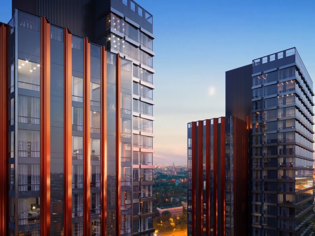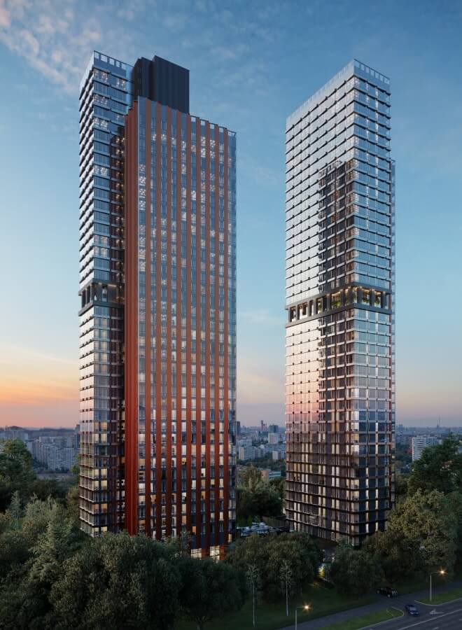 ОТРАЖАЯ НЕБО, БАШНИ ENITEO РАСТВОРЯЮТСЯ В ВОЗДУХЕ, СТАНОВЯТСЯ ЛЕГЧЕ И ПРИВЛЕКАЮТ ИГРОЙ СВЕТА НА СВОИХ ГРАНЯХ.