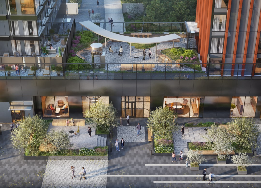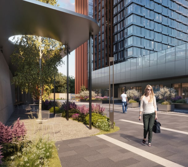 Главный вход ориентирован на Севастопольский проспект, при этом вестибюль обладает сквозным проходом в зону двора с площадками отдыха, прилегающую к парковой зоне. Основной фишкой вестибюля является его эксплуатируемая кровля которая будет являться продолжением благоустройства двора.