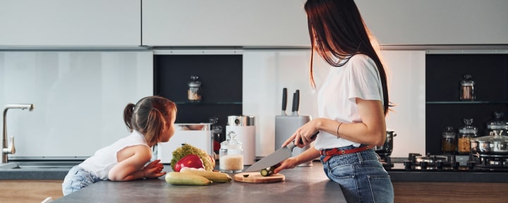 Два панорамных окна визуально увеличивают и без того просторную кухню-гостиную: к её 23,5 кв.м. прибавляется весь город за окном. Правильное зонирование комнаты делает органичными любые сценарии времяпрепровождения. Здесь удобно завтракать с видом на рассвет или ужинать перед телевизором, встречаться с гостями или готовить, не теряя детей из виду.